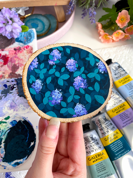 "Forest Hydrangeas" Wood Slice Acrylic Painting - 3.5x4in