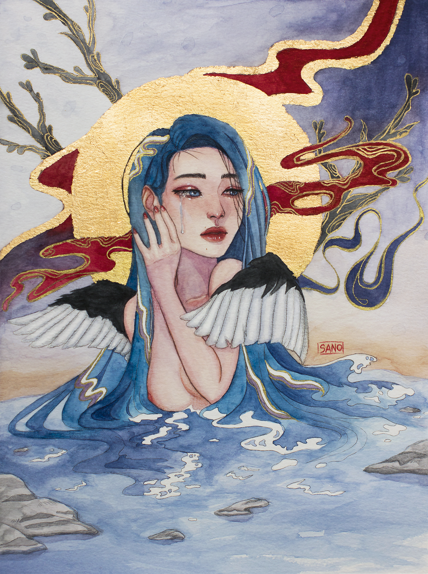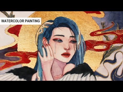 A one of a kind signed and hand painted watercolor illustration with gold leafing and gold, black, and white inking. Painting process of this piece has been featured on my YouTube channel! Watch the process here: Black Swan time lapse video.