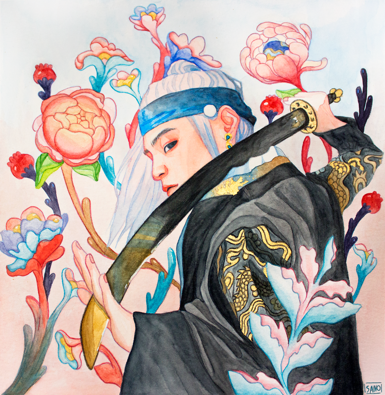 A one of a kind, signed and hand painted watercolor illustration with gold leafing featuring BTS's Min Yoongi in his Agust D "Daechwita" music video! Painting process of this piece has been featured on my Instagram and Tiktok accounts. Watch the process here: Daechwita watercolor lapse video.