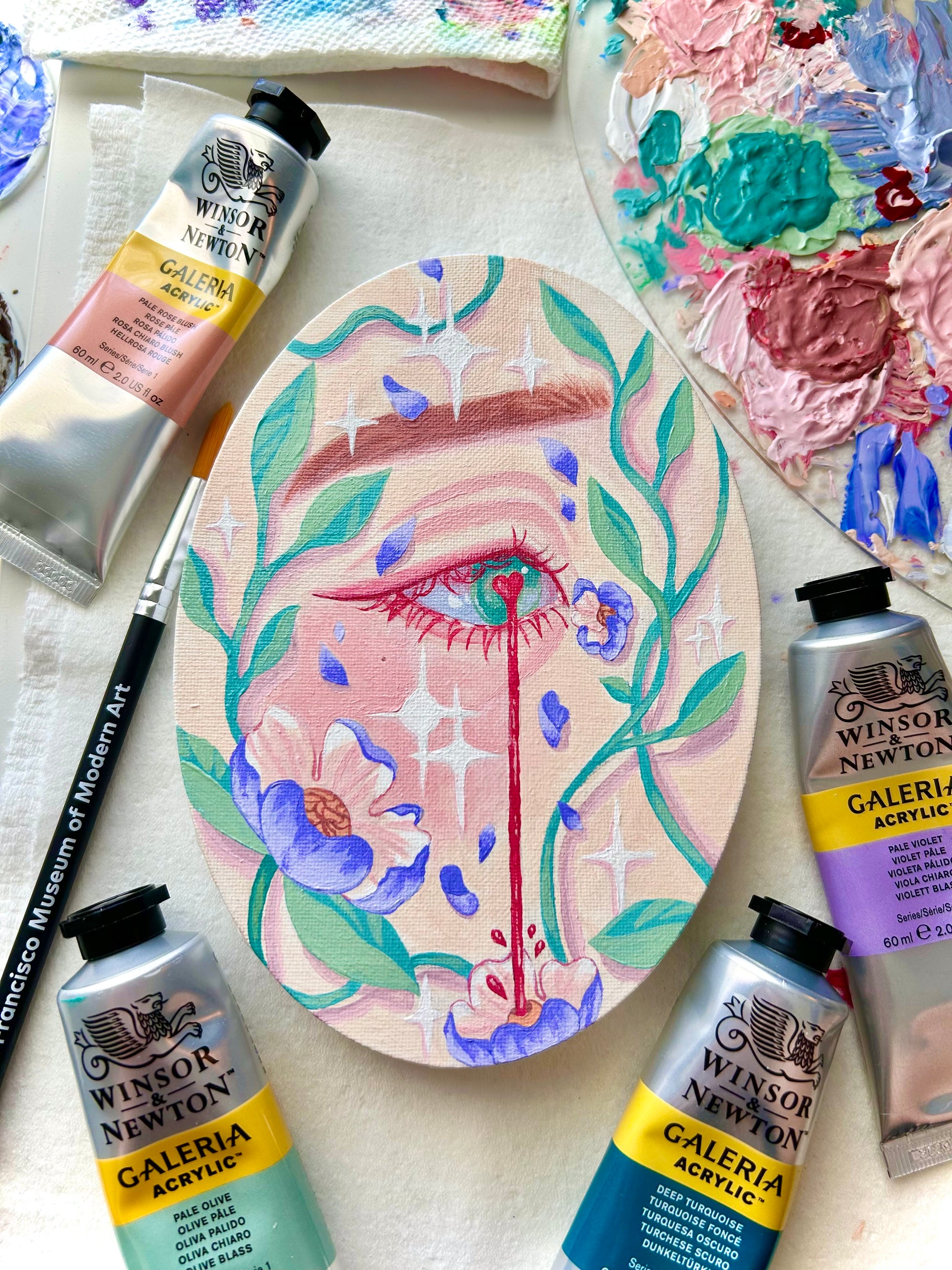 A one of a kind, hand-painted acrylic illustration on a petite oval-shaped canvas! This painting illustrates the concept of codependency and is an abstract take on mental health as a result of it. The painting features delicate flowers and leaves with a steady stream of one's own heart pouring into each flower—giving more and more of oneself to each recipient.
