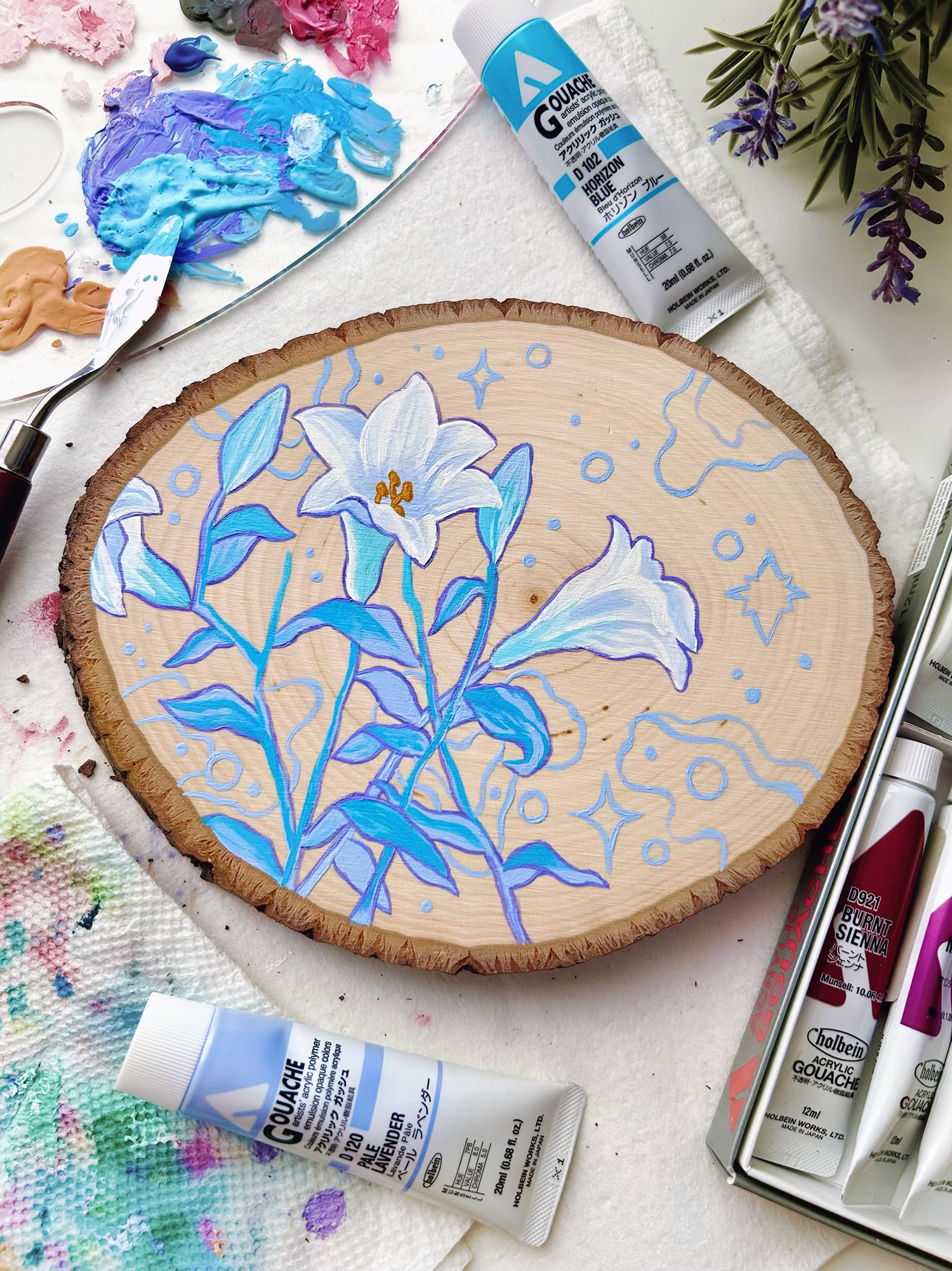 "Memories of Spring" Gouache Painting on Wood Slice - 6x7in