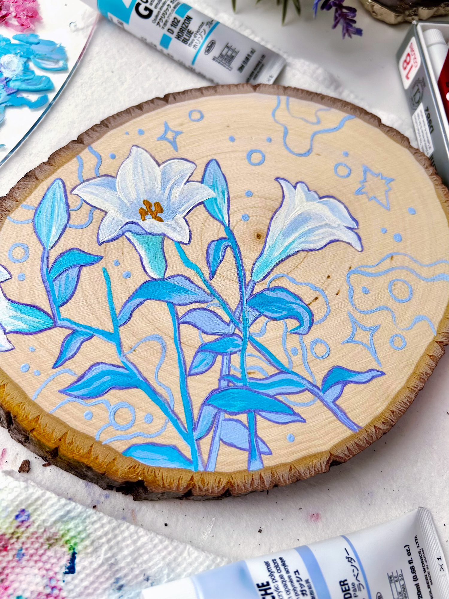 A one of a kind, hand painted gouache illustration on a medium wooden slice! This painting symbolizes the transformation from spring to summer. The painting features delicate flowers with a pop of linework and abstract shapes to brighten the piece.