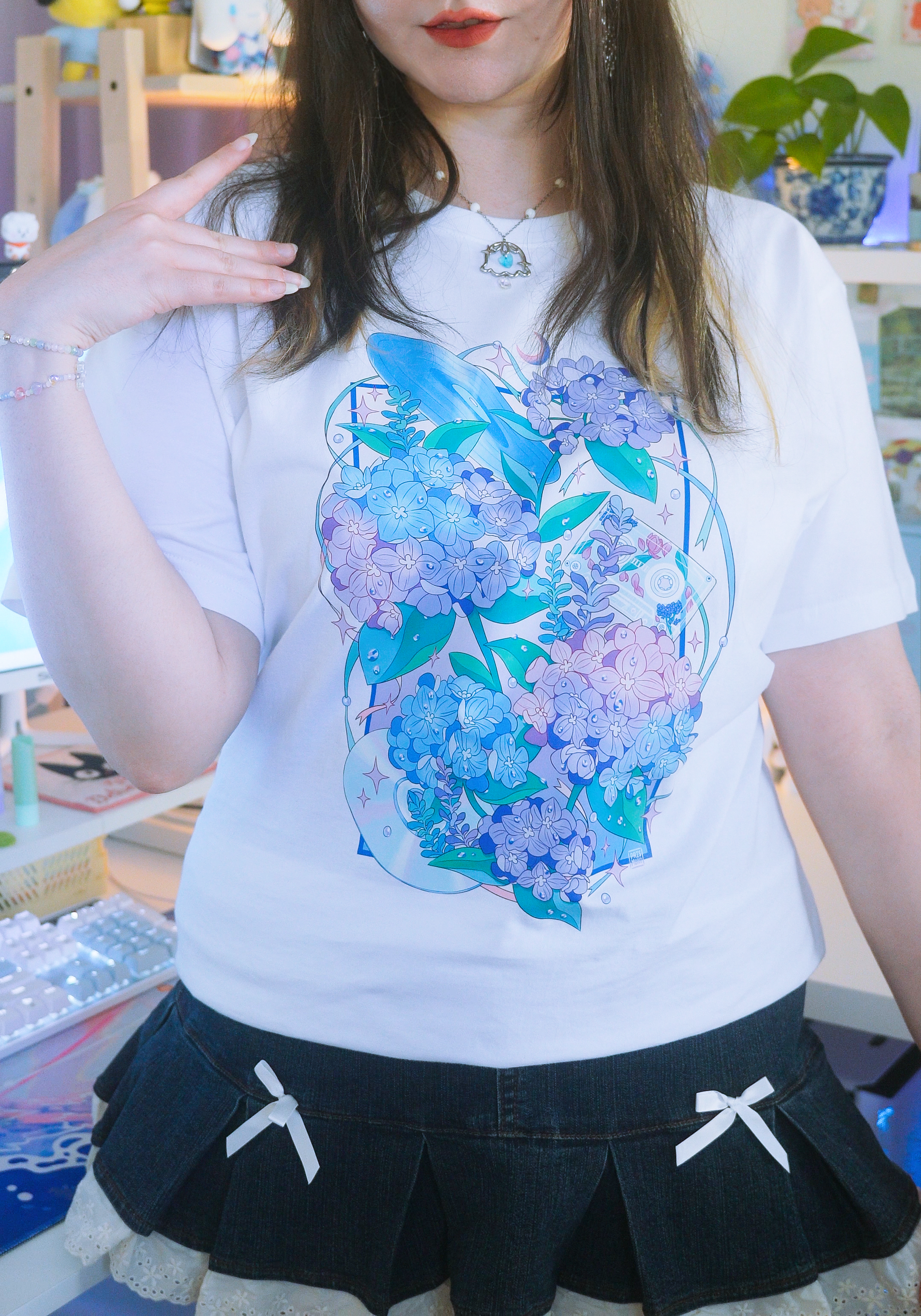 A high quality, elbow length unisex tee inspired by the nostalgic passage of time in the form of different eras of music. Vinyl records, cassette tapes, and CDs fall gracefully among multicolored hydrangeas and cool-toned hues to create the perfect record of youth. Get the complete Records of Youth hydrangea collection by checking out the postcard art print, acrylic keychain, and transparent sticker!