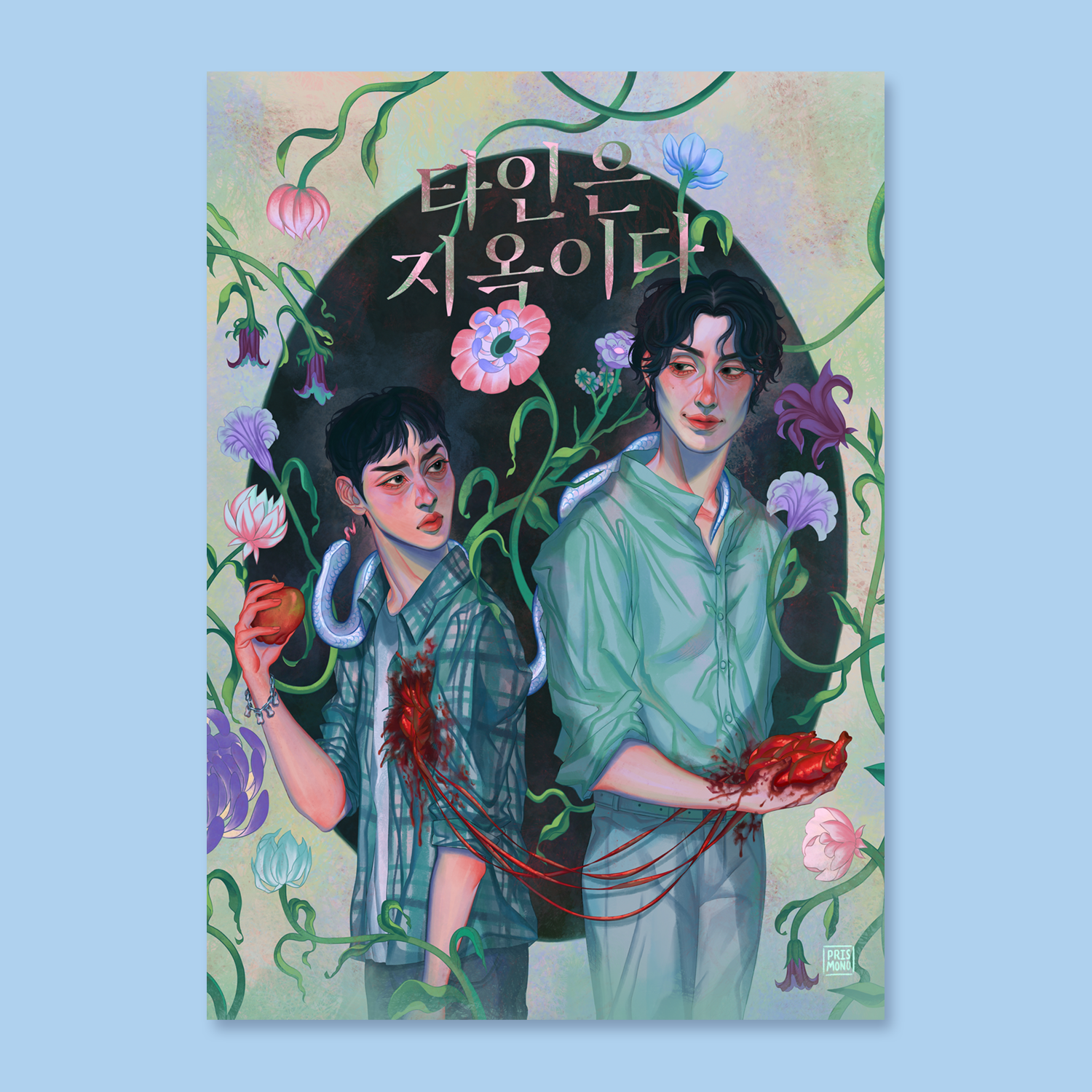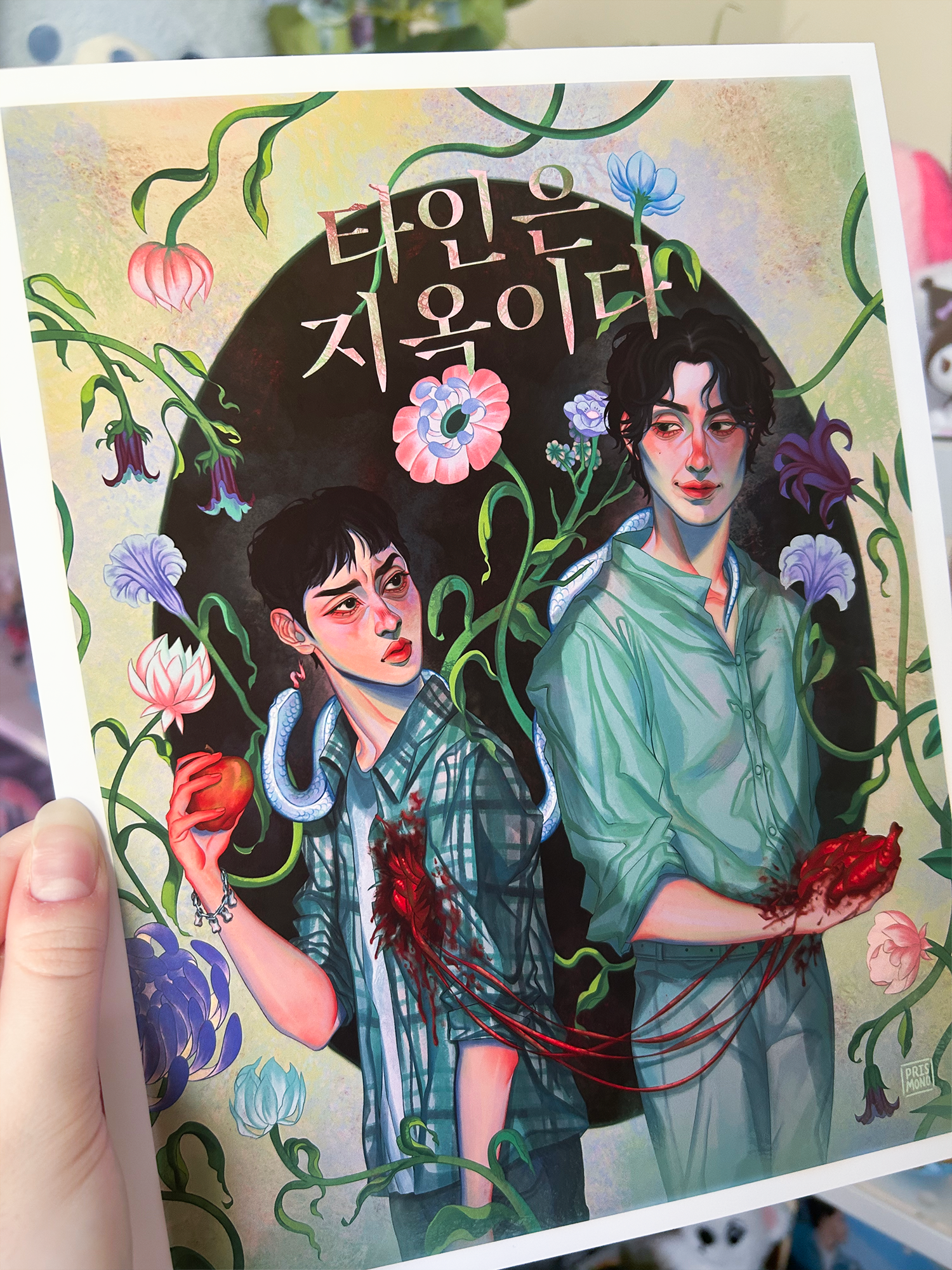 A high quality art print that comes in both 5x7" postcard or 8.5x11" art print sizes! This illustration features a botanical, garden themed piece of Yoon Jongwoo and Seo Moonjo from the Korean drama Strangers from Hell.